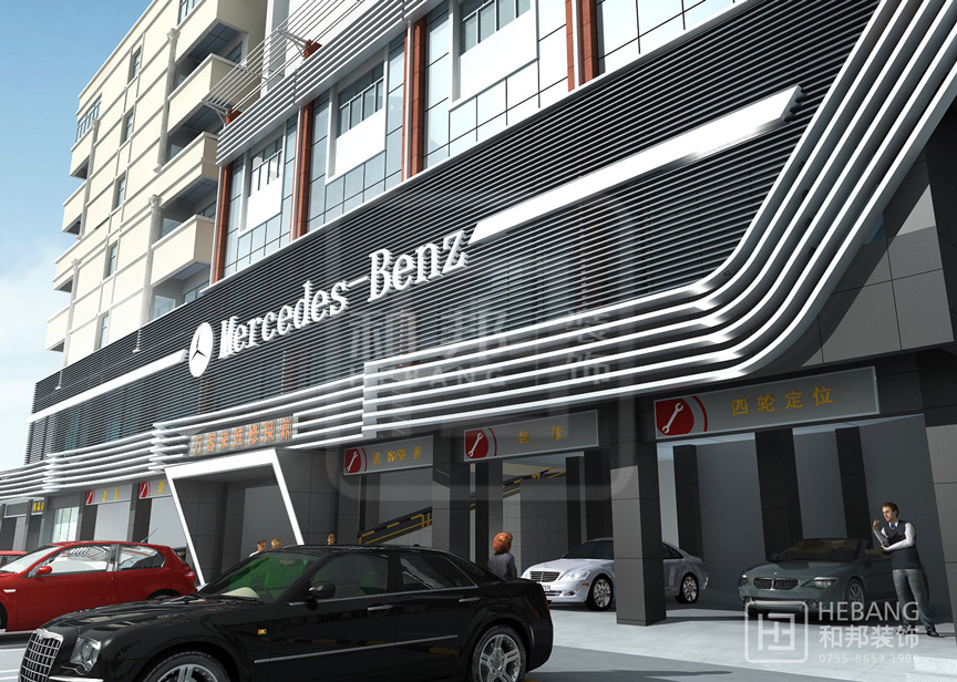 高端大氣的現代設計:以汽車頭部為原型設計的門頭,大膽新穎,創新十足。分區設計,奔馳與寶馬維修店分布兩旁,使整個維修機構美觀大方。